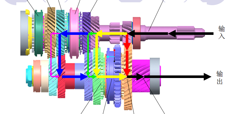 三轴变速器由输入一轴、中间轴和输出二轴组成,输出一轴和输出二轴同心,与中间轴平行,输入一轴与中间轴有一组常啮合尺寸。相比于二轴变速器,三轴变速器由于每个档位传动均有两队齿轮完成,顾传动效率要低,直接档则不通过中间轴直接输出到输出轴,并且在齿轮中心距较小的前提下依然可以获得很大的传动比。